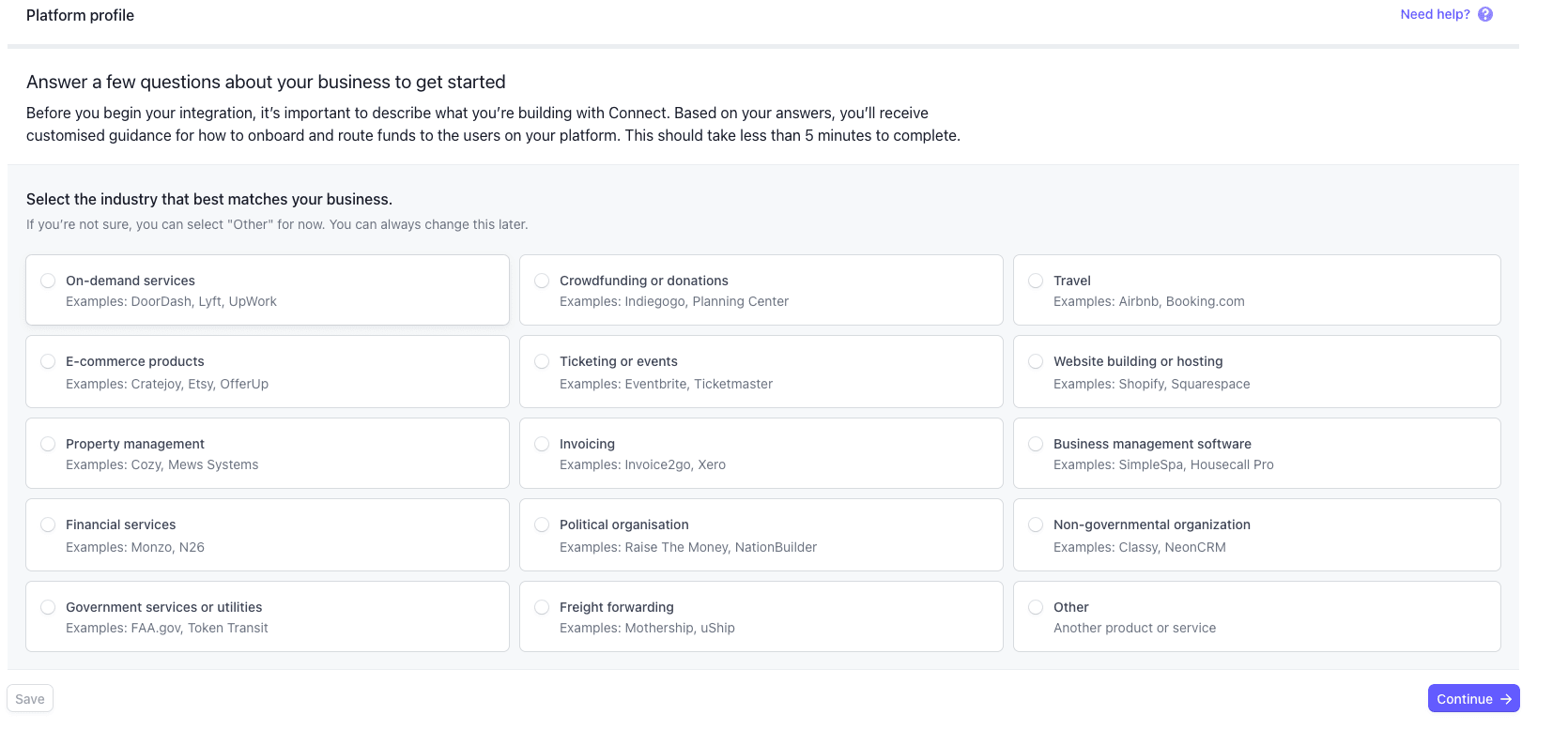 You should first follow the regular instructions to setup Stripe in your Sharetribe marketplace. When enabling Stripe Connect and registering your Platform, you may be prompted with some additional questions. The steps 1-4 show examples of what kind of questions you may be asked during the registration process.