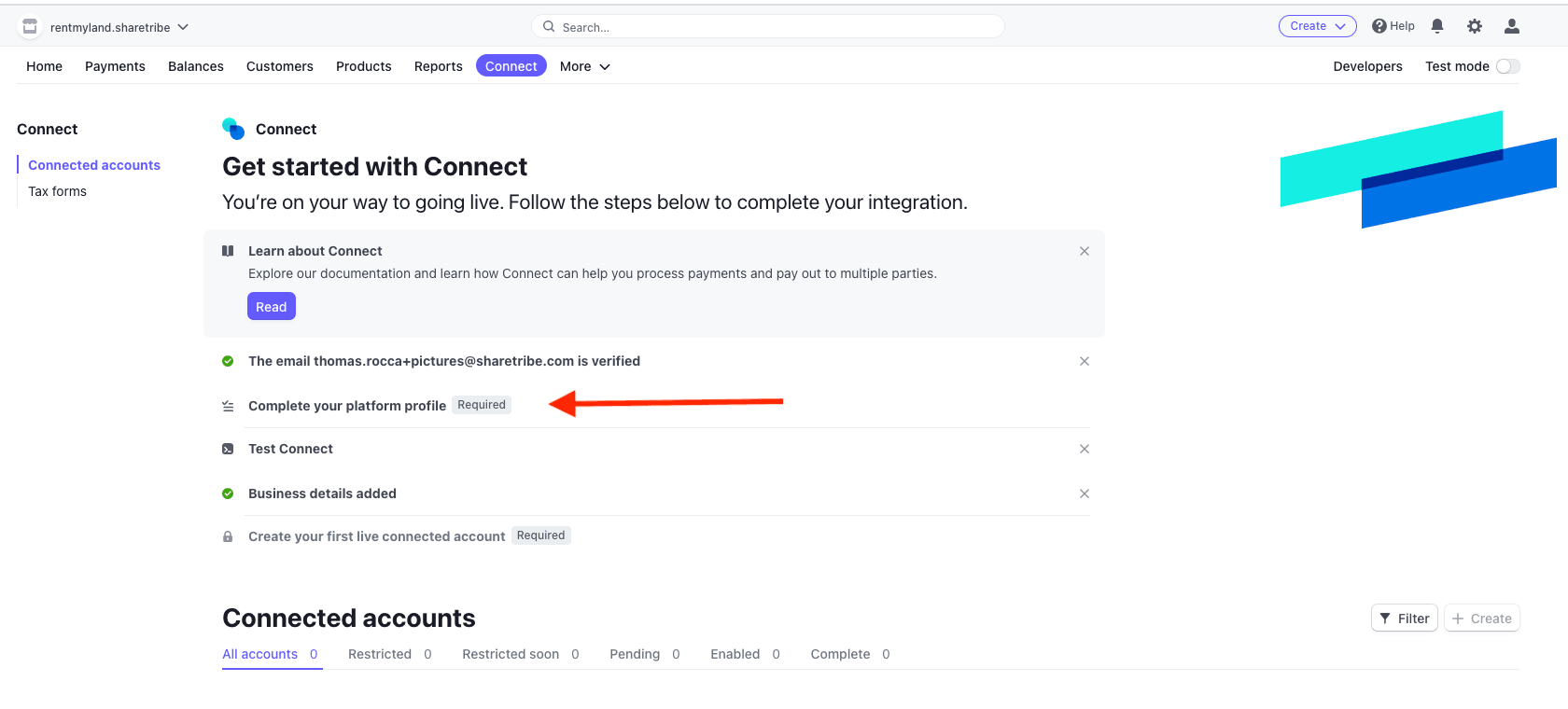 To get started with the Connect review, click on "Complete your platform profile" on the Connect page:
