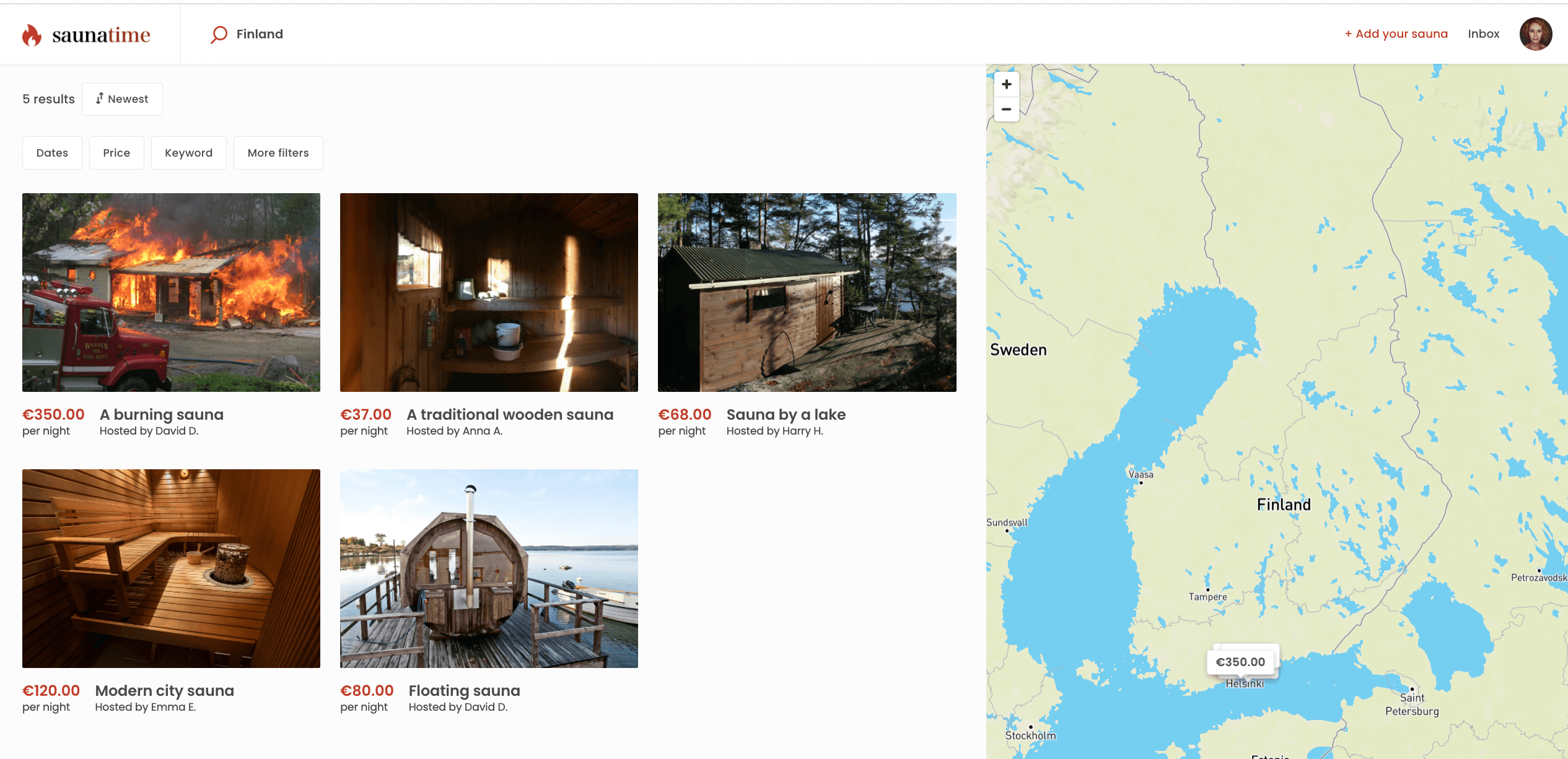 The Saunatime template enables complex filtering, including based on location, availability dates, price, and rental features. You can freely modify both the listing attributes and the search attributes to suit your marketplace.
