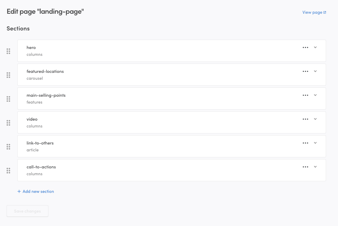 At any point you can edit your default pages by modifying the content within the default pages' Sections. Press on the Section ID to start editing it. In order to save any changes you need to click the “Save changes” button at the bottom of the page. We recommend editing one Section at a time, to make it easy to identify errors of missing fields that would prevent you from saving changes. Bear in mind that the "Save changes" button only gets enabled when there are changes to be saved. I.e. if you don’t make changes, or you make changes and then remove the changes the save button will be disabled.
