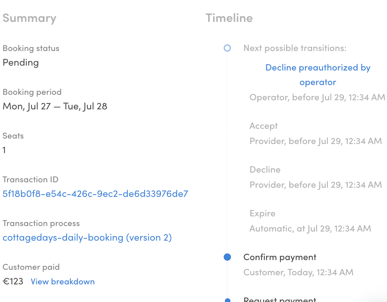 :to :state/declined-by-operator}With this configuration, we are creating a new transition called :transition/decline-preauthorized-by-operator for the operator. Because it's called before the provider has accepted the booking, it's using :action/decline-booking instead of :action/cancel-booking. Otherwise, the actions are the same as in :transition/cancel. We calculate refunds and refund the payment through Stripe. If you want to check all the possible actions, you should read this document: Transaction process actions.