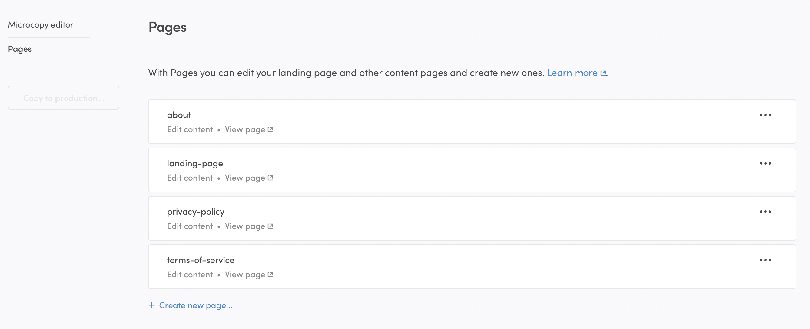 For each page, you can see two links: Edit content and View page. To edit a page, you can either click the link, or just click anywhere in the white container for the page.